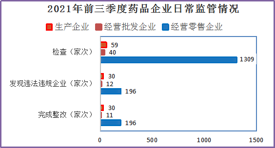 2021年前三季度,全市检查药品生产企业59家次,未发现违法生产企业;发现违规生产企业30家次,完成整改30家次;检查药品经营批发企业40家次,发现违法违规经营批发企业12家次,完成整改11家次;检查药品经营零售企业1309家次,发现违法违规经营零售企业196家次,完成整改196家次。