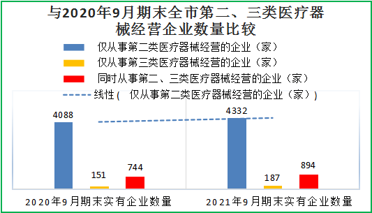 截至2021年9月底,全市实有仅从事第二类医疗器械经营的企业4332家,仅从事第三类医疗器械经营的企业187家, 同时从事第二、三类医疗器械经营的企业894家,较去年同期(4088家,151家,744家) 分别增长5.97%、23.84%、20.16%。
