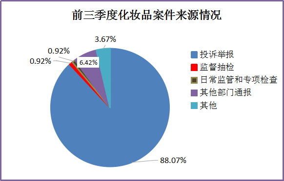 从案件来源划分来看,以投诉举报的案件为主,共96件,占化妆品案件总数的88.07%;监督抽验的案件1件;日常监管和专项检查案件1件;其他部门通报的案件7件;其他4件。