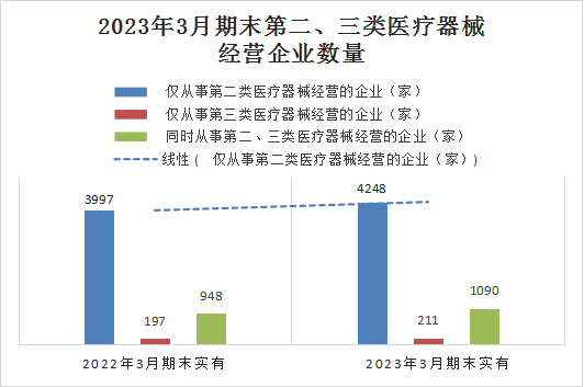 截至2023年3月底,全市实有从事第二类、三类医疗器械经营企业5549家,较去年同期(5142家)增长7.92%,其中仅从事第二类医疗器械经营的企业4248家,仅从事第三类医疗器械经营的企业211家, 同时从事第二、三类医疗器械经营的企业1090家。详见附表7。