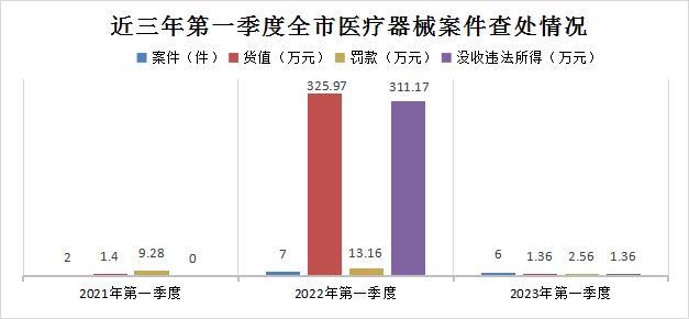 2023年第一季度,全市共查处医疗器械案件6件,较去年同期(7件)下降14.29%;案件货值1.36万元,罚款2.56万元,没收违法所得1.36万元。详见附表11。