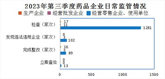 2023年第三季度,全市共检查药品生产企业17家次(其中: 麻药、精神药品、易制毒化学品生产企业2家次,含血液制品、注射剂等高风险品种的生产企业3家次),未发现违法违规的生产企业,完成整改16家次;检查药品经营批发企业11家次,发现违法违规经营批发企业3家次,完成整改3家次;检查药品经营零售企业、使用单位1281家次,发现违法违规经营零售企业、使用单位102家次,完成整改89家次,立案查处13家次。详见附表2—4。