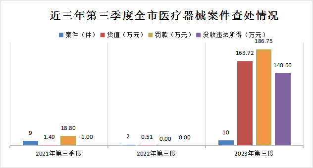 2023年第三季度,全市共查处医疗器械案件10件,较去年同期(2件)增长400%;案件货值163.72万元,罚款金额186.75万元,没收违法所得140.66万元。详见附表11。