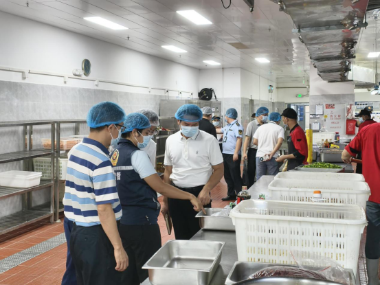 ▲南区街道办事处副主任薛焯明检查中山市永安中学、中山市华伟技工学校食堂并自费陪餐。