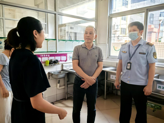▲中山港街道党工委委员何志峰检查中山市纪雅学校、中山市三鑫凯茵学校食堂并自费陪餐。