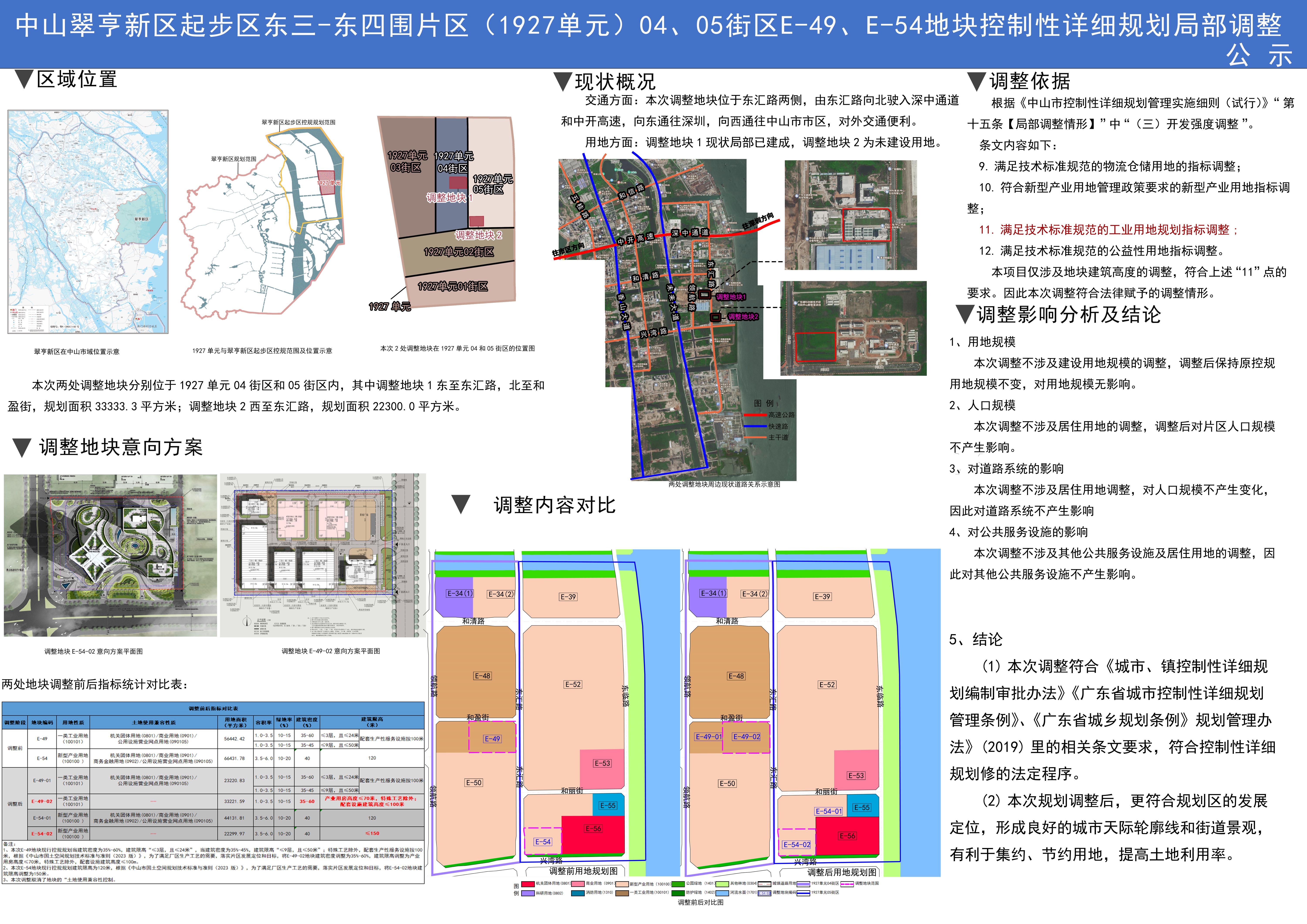 根据《中华人民共和国城乡规划法》,现对《中山翠亨新区起步区东三—东四围片区(1927单元)04、05街区E-49、E-54地块控制性详细规划局部调整》规划草案予以公示。