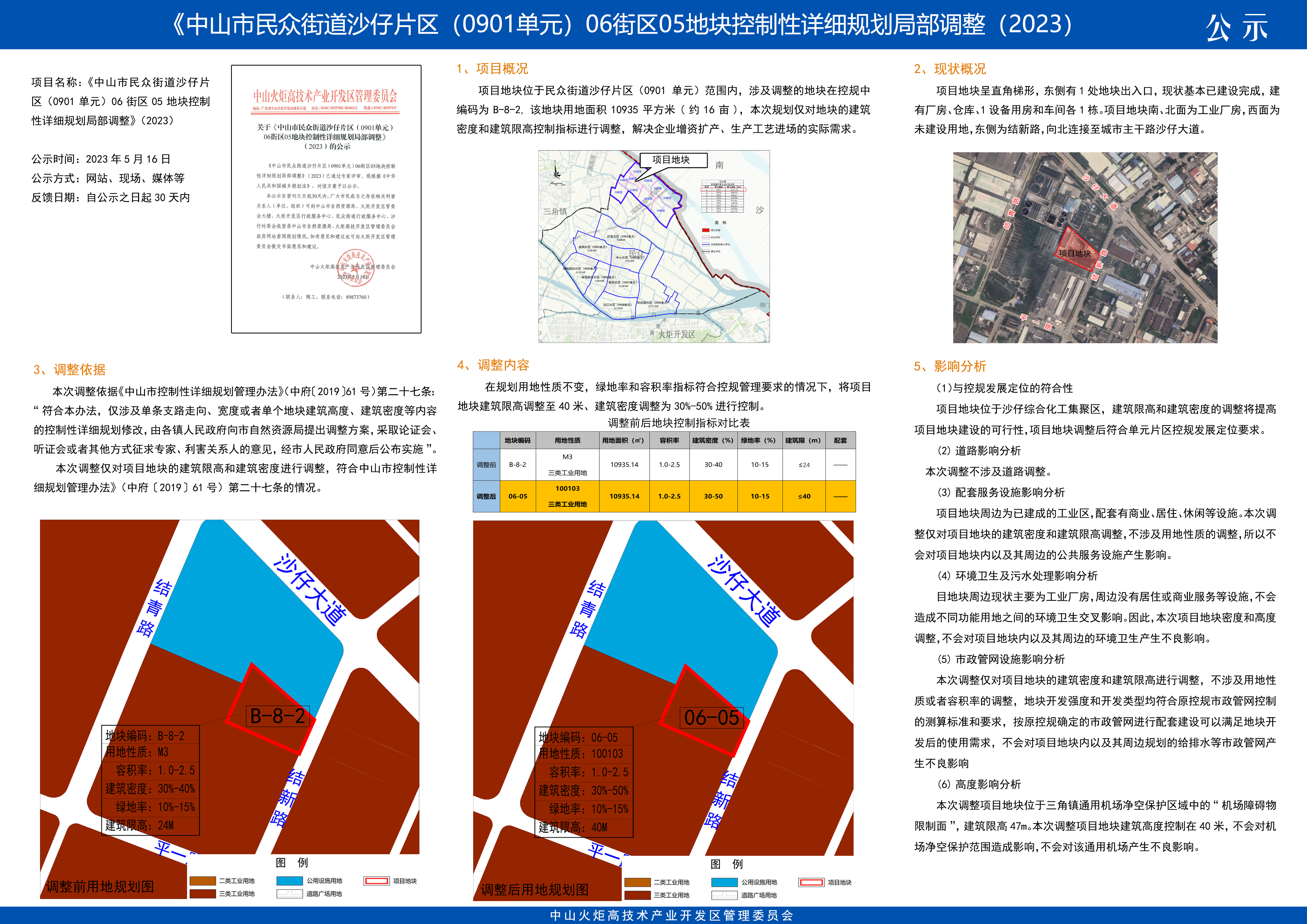 《中山市民众街道沙仔片区(0901单元)06街区05地块控制性详细规划局部调整》(2023)已通过专家评审。现根据《中华人民共和国城乡规划法》,对该方案予以公示。
