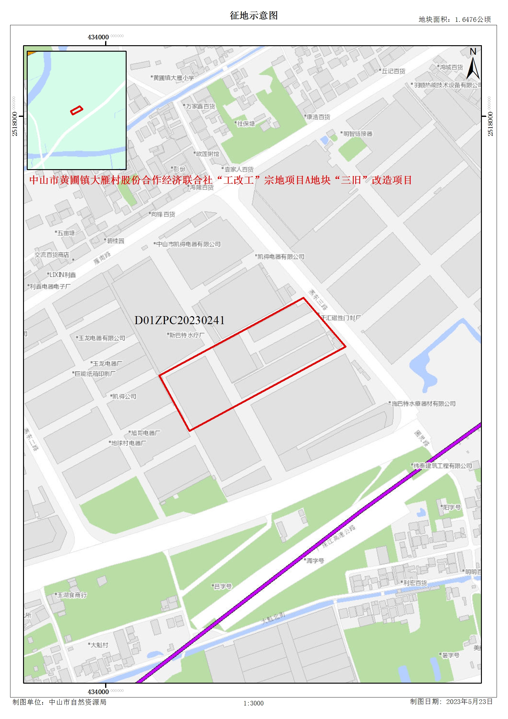 一、拟征收土地的面积、位置和范围:1.6476公顷,位于中山市黄圃镇大雁村(四至范围详见附图)。