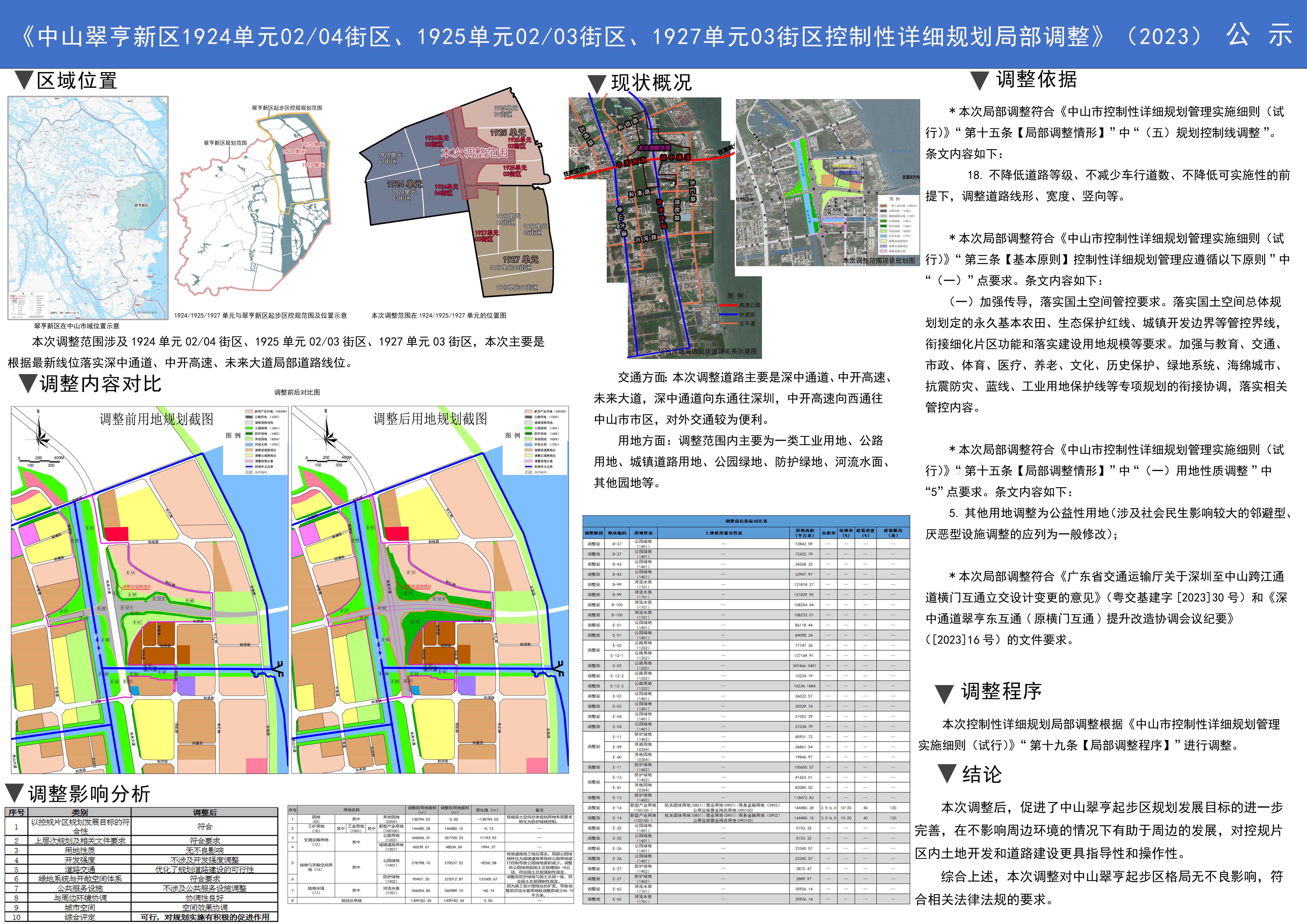 根据《中华人民共和国城乡规划法》,《中山翠亨新区1924单元02/04街区、1925单元02/03街区、1927单元03街区控制性详细规划局部调整》(2023)草案已完成,现对该草案予以公示。