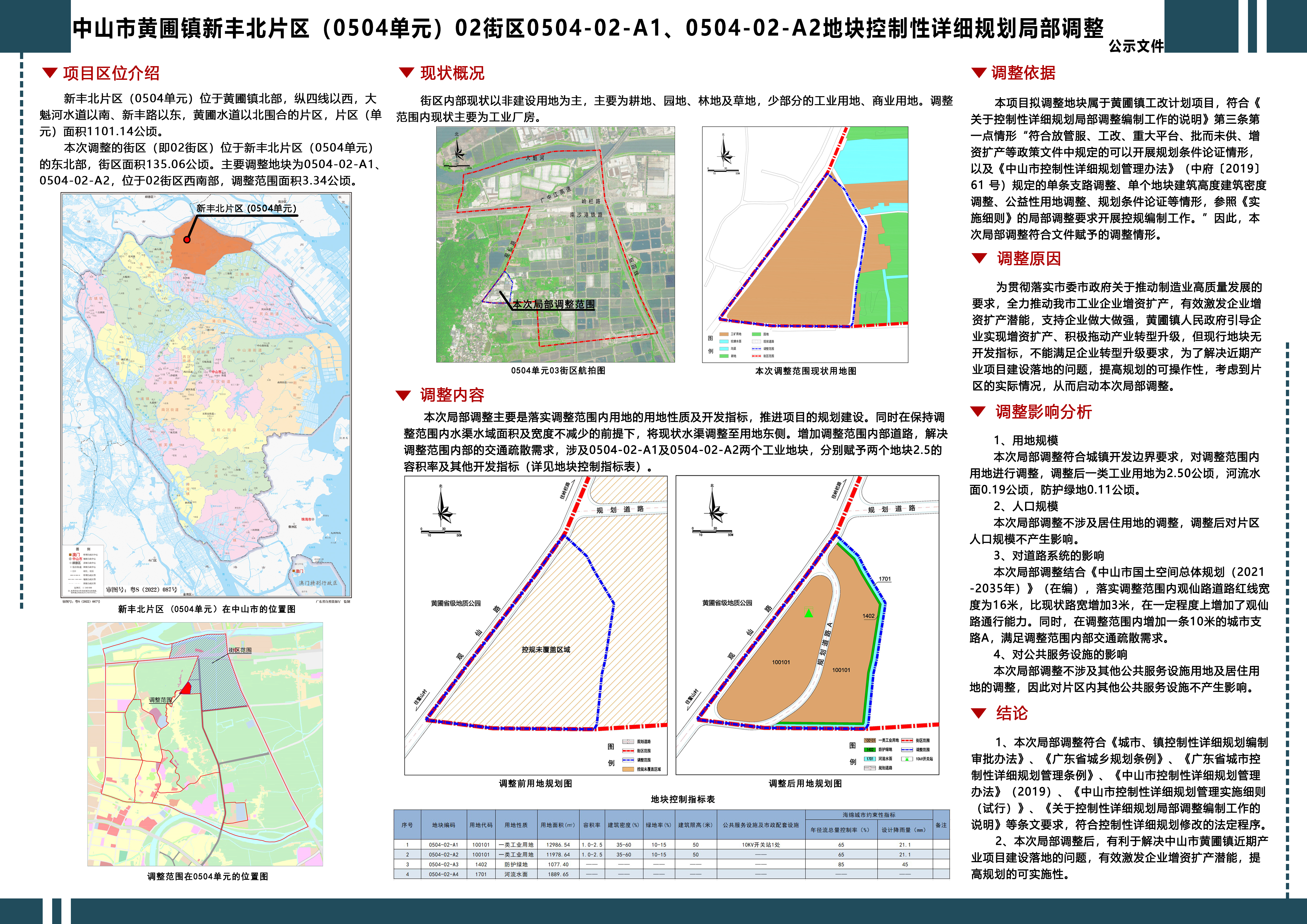 为指导黄圃镇观仙路工业片区旧厂房改造升级,由黄圃镇人民政府组织编制了《中山市黄圃镇新丰北片区(0504单元)02街区0504-02-A1、0504-02-A2地块控制性详细规划局部调整》方案(以下简称方案),根据《中华人民共和国城乡规划法》等法律法规要求,现对该方案予以公示: