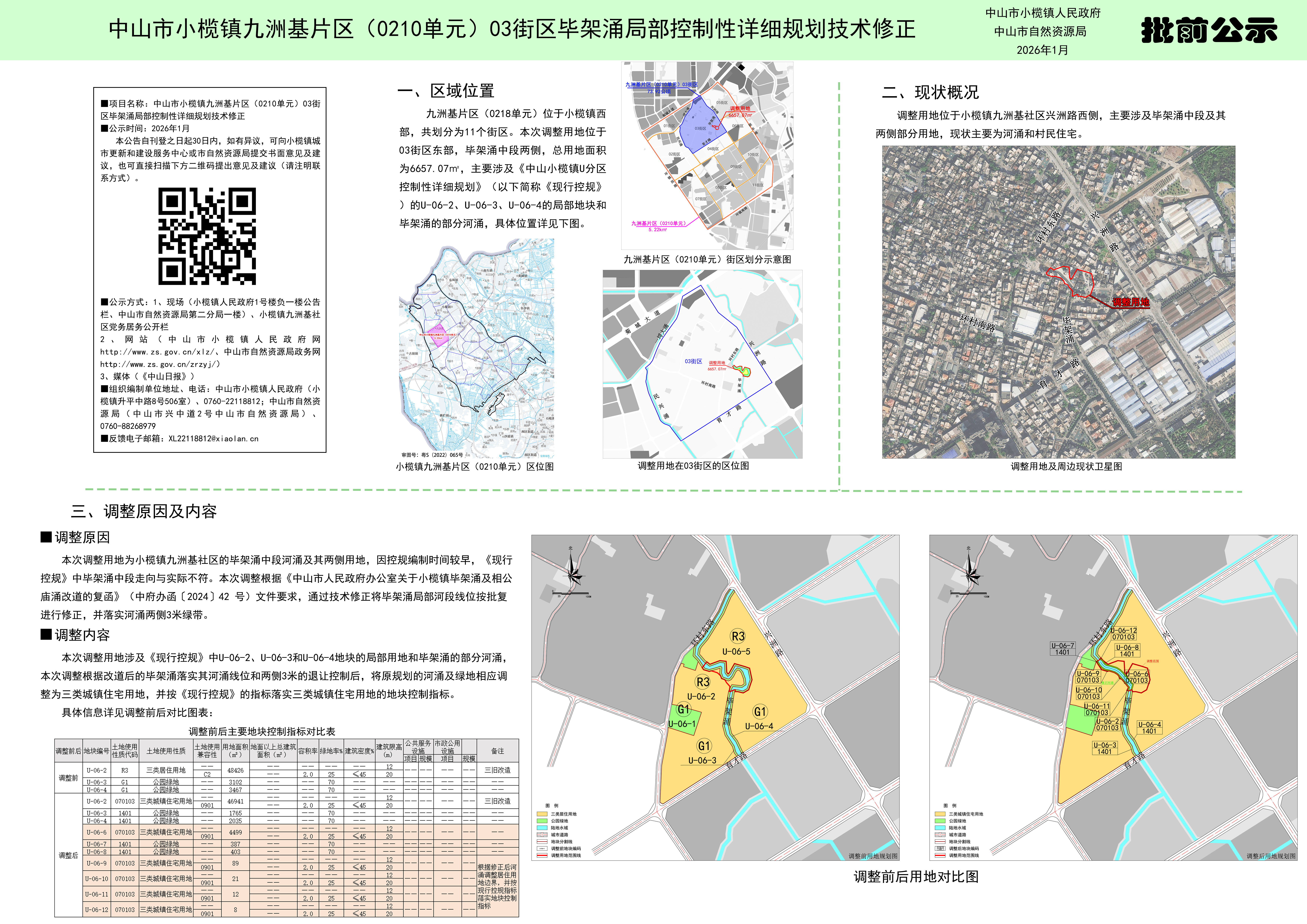 《中山市小榄镇九洲基片区(0210单元)03街区毕架涌局部控制性详细规划技术修正》规划草案编制完成,依据《中华人民共和国城乡规划法》等文件规定,现将规划草案予以公示,广泛征求社会各界意见。