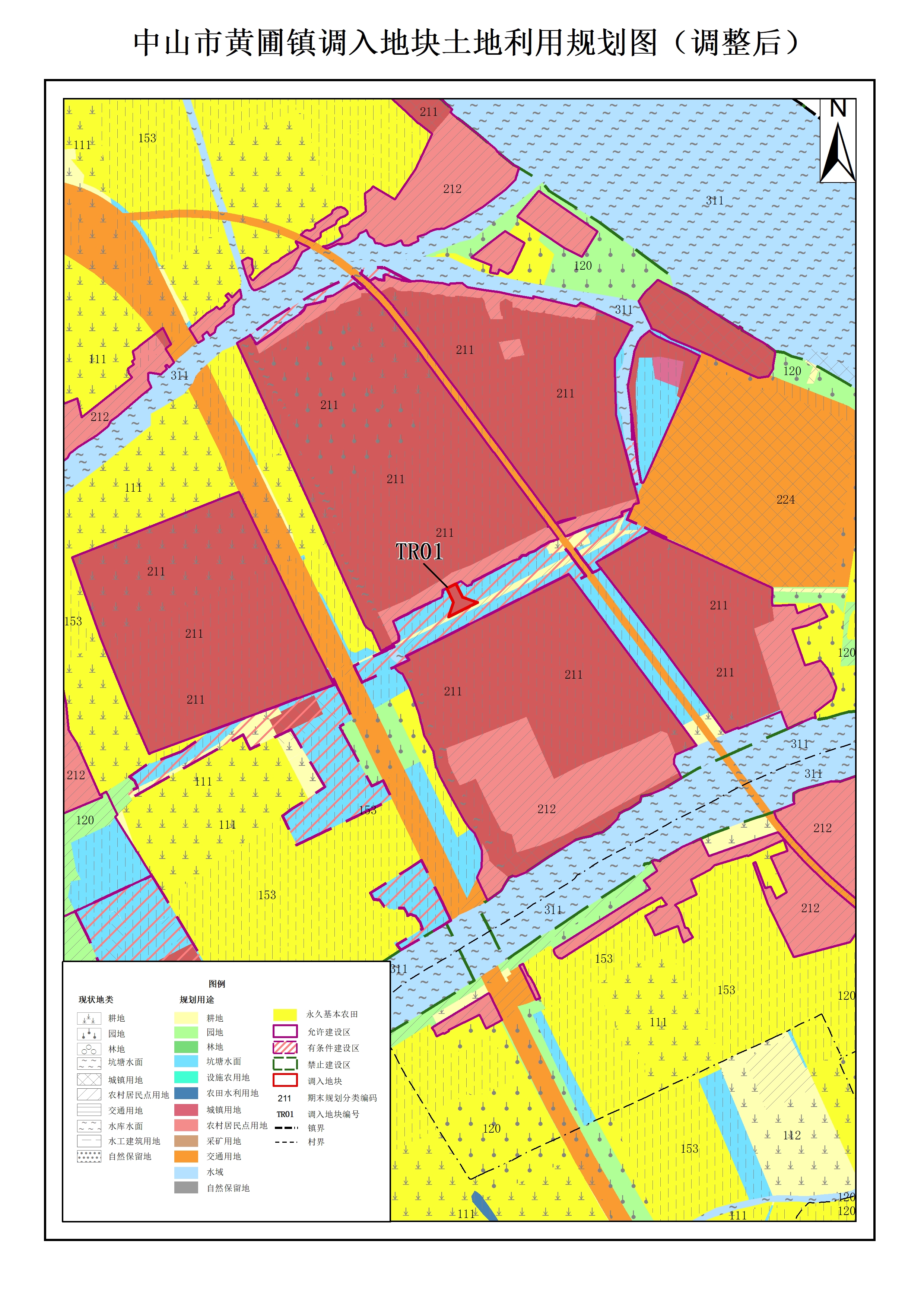 《方案》调入地块共2个(TR01、TR02),面积3.0165公顷,位于中山市黄圃镇吴栏村和马安村,土地利用现状为农用地0.2061公顷、建设用地2.8104公顷。调出地块共1个(TC01),面积3.0165公顷,位于中山市黄圃镇永平社区,土地利用现状为农用地3.0165公顷。