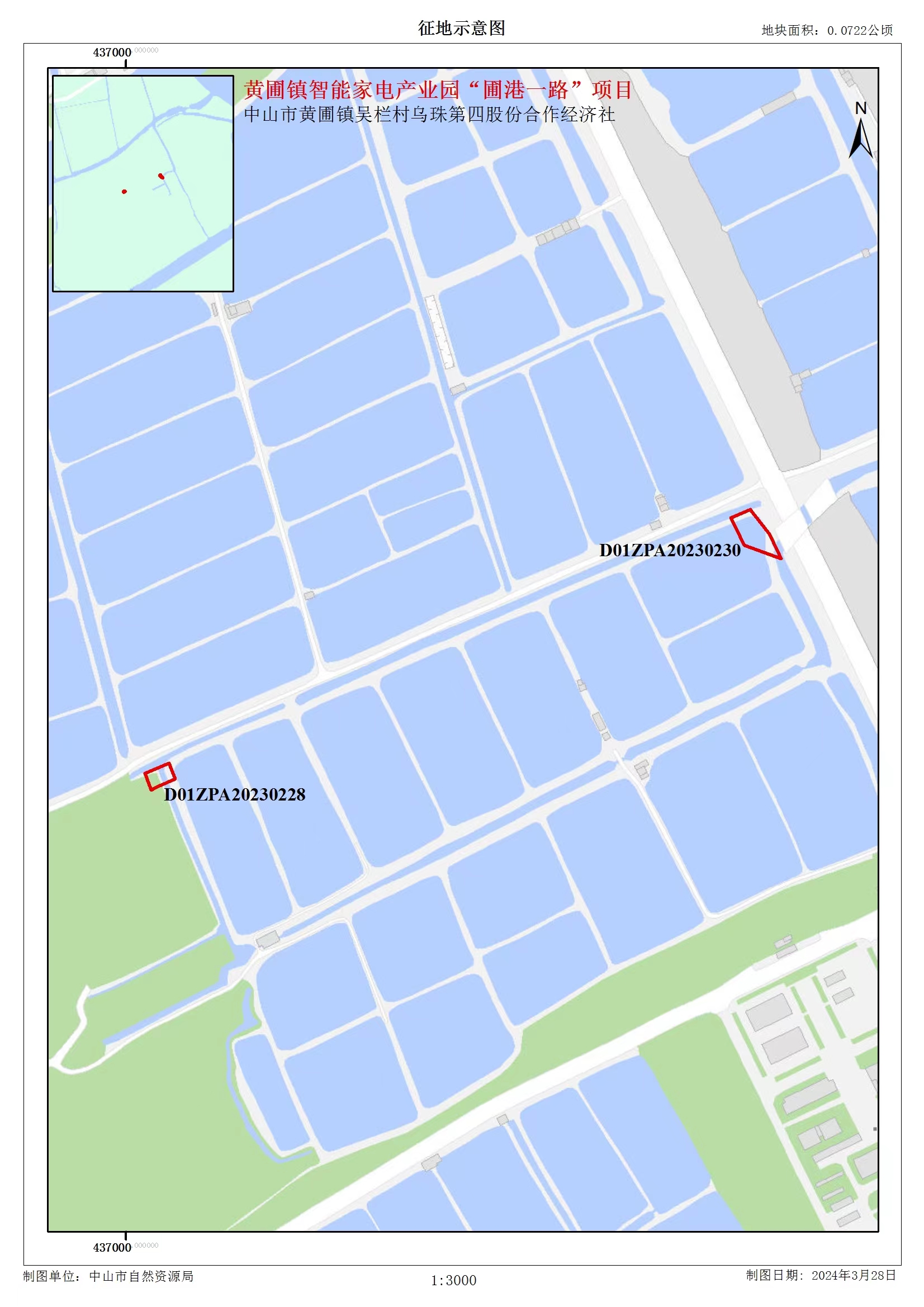 中山市黄圃镇吴栏村乌珠第四股份合作经济社农民集体土地0.0722公顷,其中其他农用地0.0722公顷,位于中山市黄圃镇吴栏村,具体范围及现状见附图(如需获取更为详细的地理位置和四至信息,请询公告所示联系人)。
