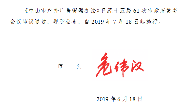 第四十六条 本办法自2019年7月18日起施行,《中山市户外广告设置管理规定》(中府〔2005〕56号)同时废止。本市原关于户外广告管理的规定与本办法不一致的,按本办法规定执行。