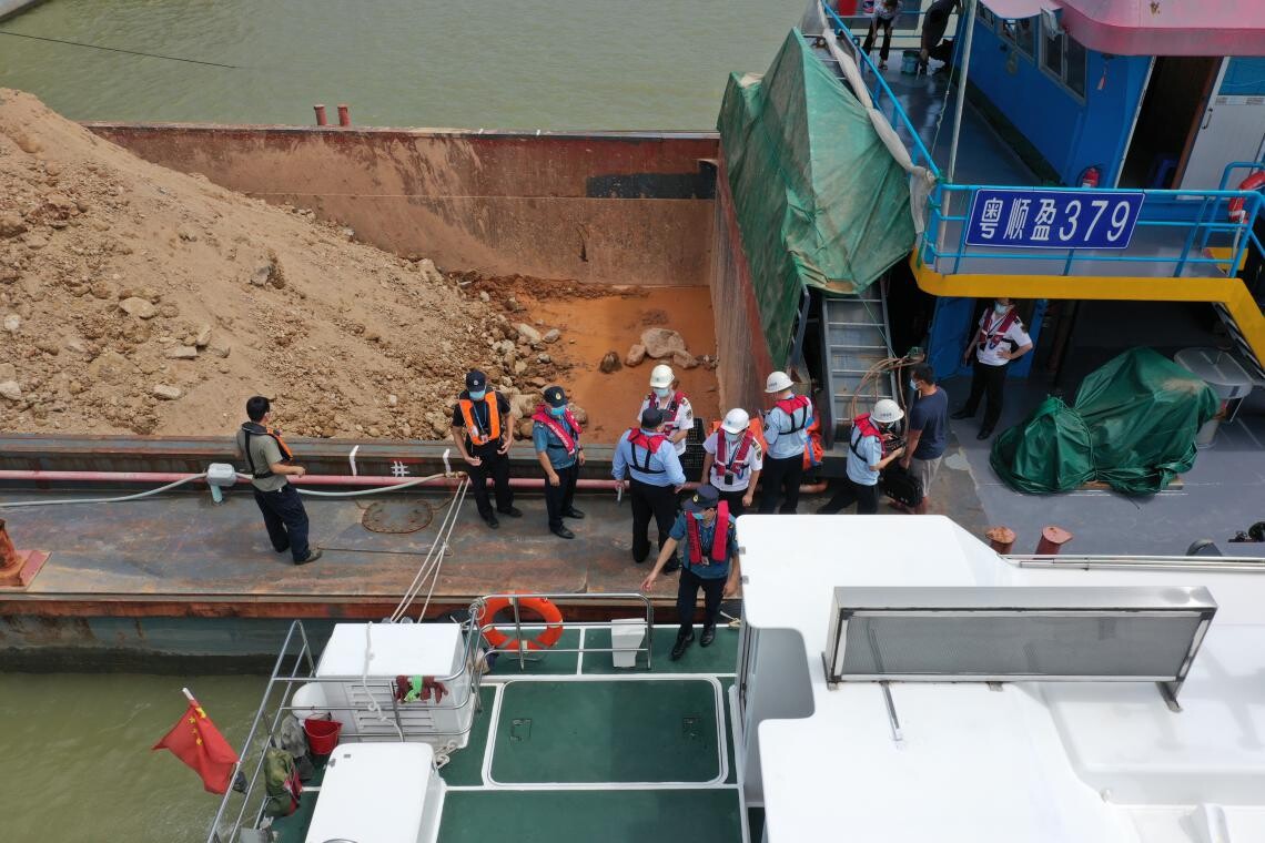 执法人员在横门东水道及东、西出海航道进行巡航,并对粤广州货0**8运砂船、粤*盈3**运泥船等运输船舶进行登轮检查,对该船舶证书合法性,运输砂石合法来源证明等进行检查。重点加强对运输船舶经营行为、水路反走私反偷渡行为及“三无”船舶运输行为、航道通航碍航行为、水域偷采河砂海砂行为、出海水道与河道水域非法洗砂洗泥等违法违规行为进行查处。