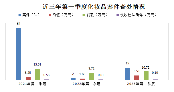 2023年第一季度,全市共查处化妆品案件15件,较去年同期2)增长650%货值5.51万元罚款10.72万元,没收违法所得0.19万元详见附表13